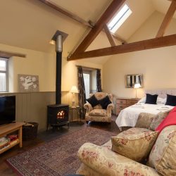 The traditional dining table is perfectly placed so everyone can be together to enjoy the chit chat and catch up on the day’s adventures. You will also fine the log burning stove in this space along with comfy armchairs to relax by the roaring fire.