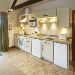 Characterful beams offer a touch of the cottages past, with a soft colour palette throughout and comfy interiors, the space is a real home from home retreat. An electric stove allows for additional comfort along with a smart TV and three windows showcase the views and natural light. The kitchen is well equipped offering oven and hob, fridge with box freezer, dishwasher and microwave. Washing facilities are available within a shared laundry facility if required.