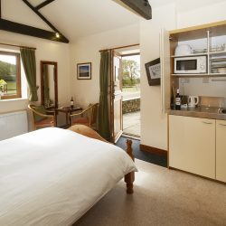 Gowland studio room is well equipped and includes a digital flat screen television and two comfortable chairs. There is a full-sized en-suite with an electric shower over the bath. It has its own private entrance, which is accessible from the south facing courtyard. There is a large south facing window overlooking rolling fields towards Rawcliffe Bank.