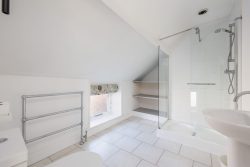 Ascending the second flight of stairs, you will find three more inviting bedrooms—with double beds. Consistent with the first two bedrooms, these spaces are thoughtfully arranged to ensure comfort and tranquillity, providing an ideal environment for a restful night’s sleep. This floor also includes another bathroom, featuring a spacious walk-in shower, basin, and toilet.